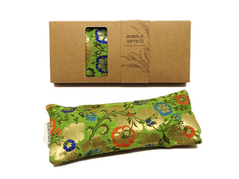 Een prachtig cadeautje voor jezelf of iemand anders. De hoesjes zijn gemaakt van Indiase zijde en viscose, met een binnenkussen van muslin katoen, en een vulling van biologische lijnzaad en biologische lavendelbloemen. De zachte druk van de lijnzaadvulling, de verrukkelijke geur van lavendel, en de natuurlijke koelte van de stof zullen je zeker helpen je geest tot rust te brengen. Door de vulling af en toe door de stof heen tegen elkaar te wrijven komt er weer meer geur vrij uit de lavendelbloemen. De afmetingen zijn 10,5 x 22 cm. Ze komen in een mooi en handig opbergdoosje van Paperwise papier gemaakt van landbouwafval.